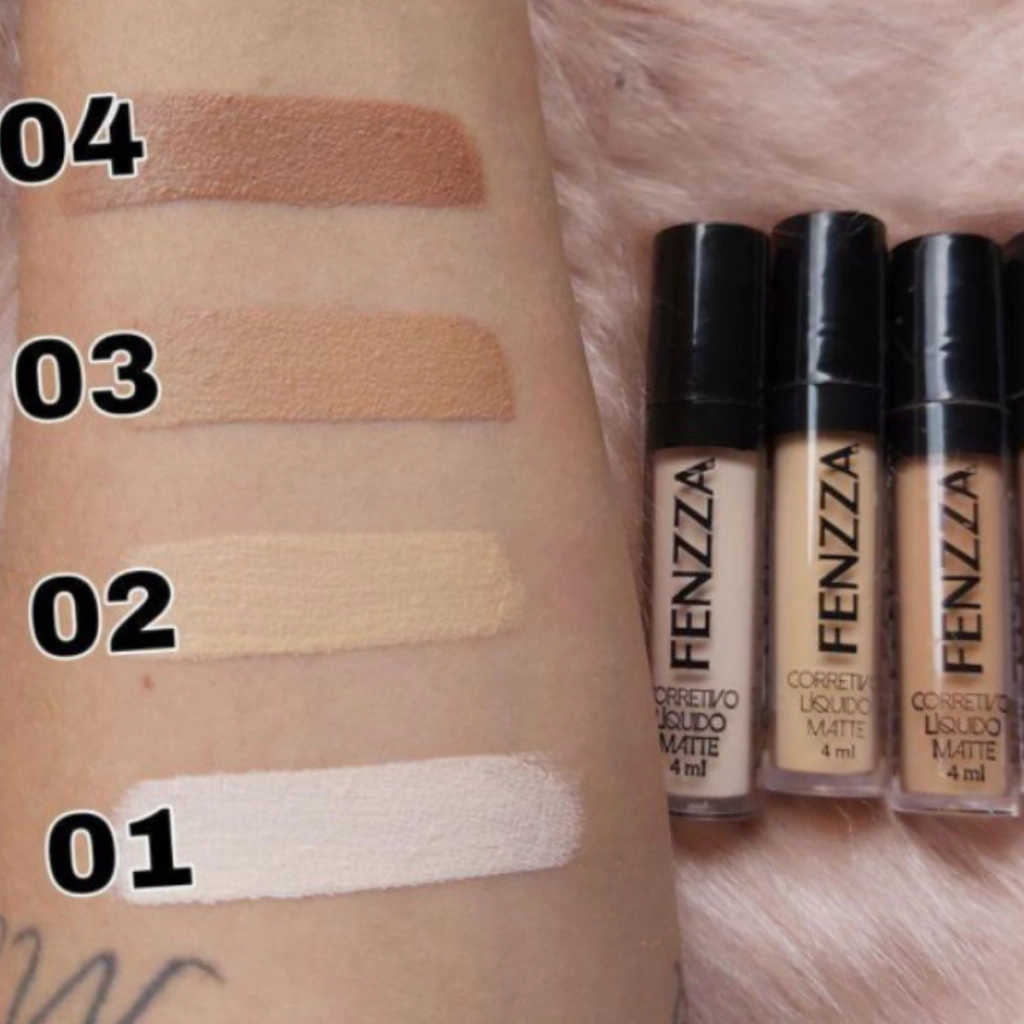 O Corretivo Líquido Matte - Fenzza possui uma textura cremosa e cobertura média, sendo possível ainda fazer uma cobertura mais leve aplicando menos produto, ou uma cobertura mais alta aplicando mais produto. Possui secagem rápida, toque seco, é de fácil aplicação e consegue camuflar bem manchinhas, olheiras e disfarçar imperfeições da pele. Tudo isso em uma embalagem super compacta, perfeito para carregar na sua necessáire.
