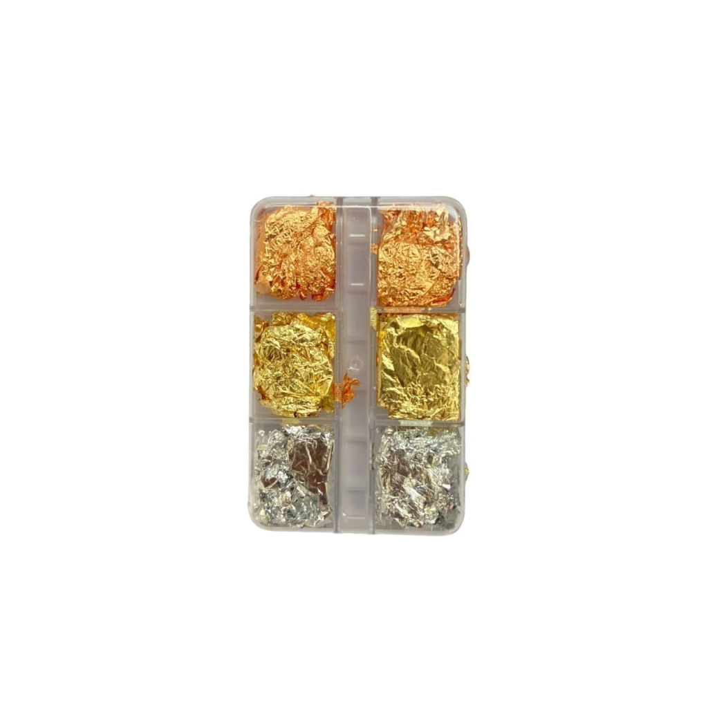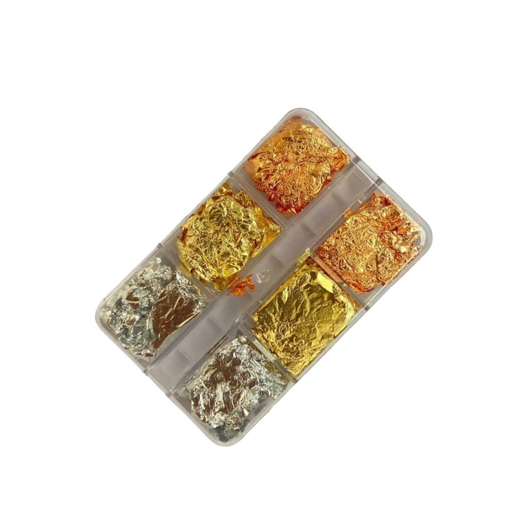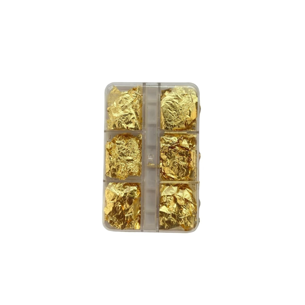 Cada caixinha contém finas folhas de ouro, proporcionando uma decoração sofisticada e brilhante para unhas elegantes e estilosas.