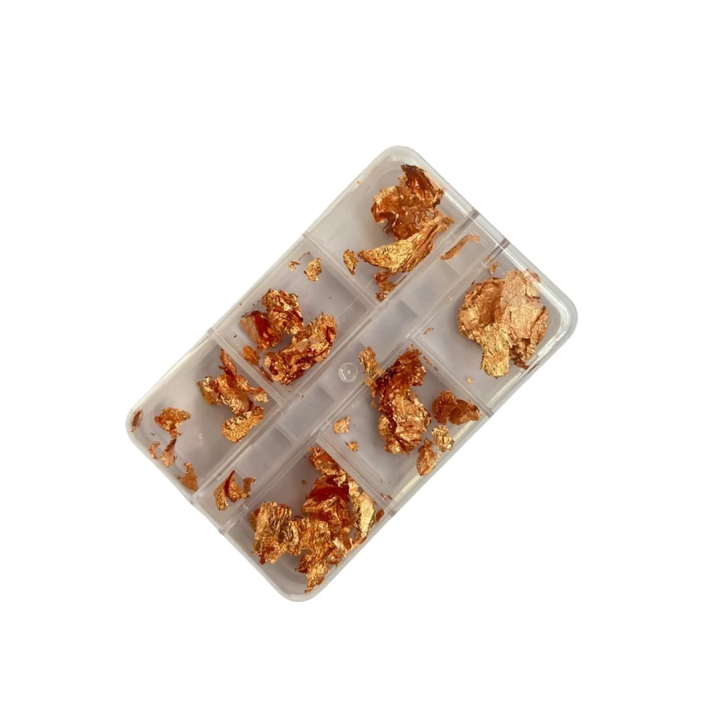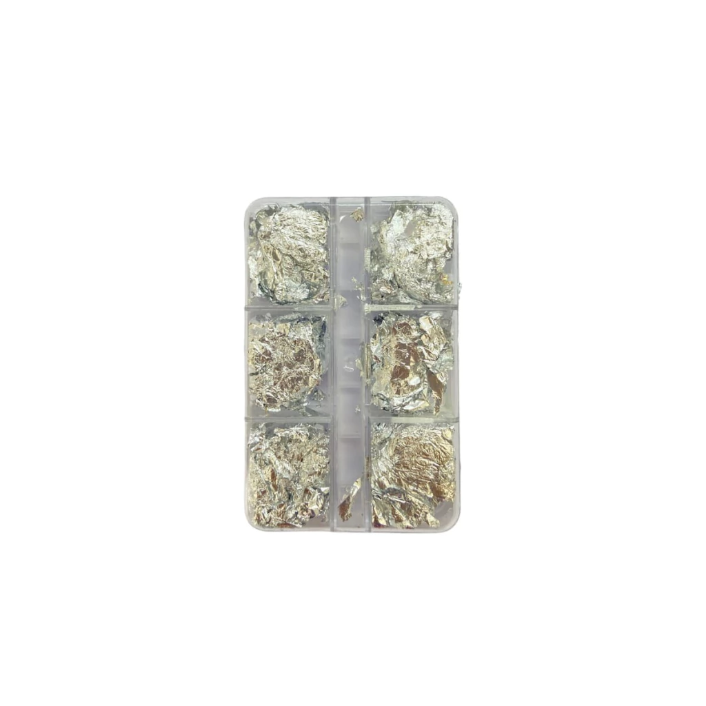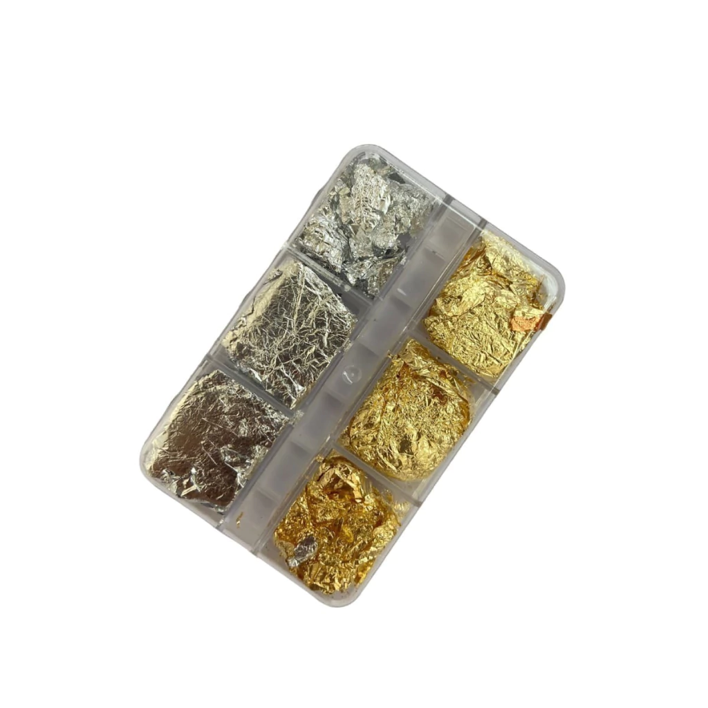 Cada caixinha contém finas folhas de ouro, proporcionando uma decoração sofisticada e brilhante para unhas elegantes e estilosas.