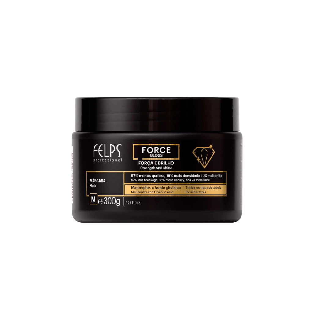 Máscara Force Gloss rico em Marineplex, um complexo exclusivo de algas marinhas, aminoácidos e peptídeos, aliado ao Ácido Glicólico e ao nutritivo Óleo de Crambe. Essa combinação poderosa atua diretamente na fibra capilar, redensifica e revitaliza, devolvendo força, densidade e brilho aos fios. Com moléculas bioativas de alta performance promove 57% menos quebra, 18% mais densidade e 2X mais brilho aos fios desde o primeiro uso. Para cabelos visivelmente mais encorpados, jovens, fortes e resistentes desde a primeira aplicação. Tratamento indicado para cabelos com quebra, fragilizados e finos.
