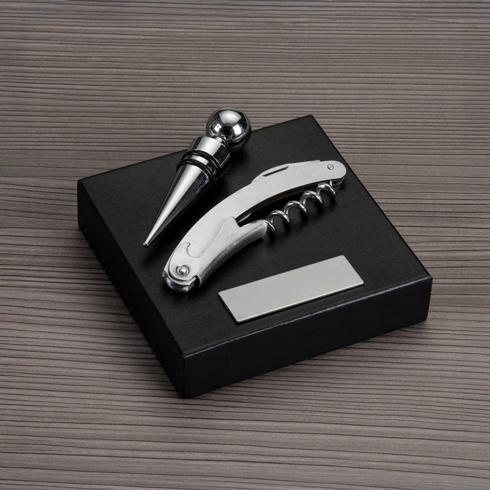Kit vinho 2 peças em estojo com tampa, contém saca-rolhas metálico com lâmina de corte e abridor de garrafa e tampa de bico. Área interna do estojo com berço de espuma. Acompanha plaquinha metálica para personalização.